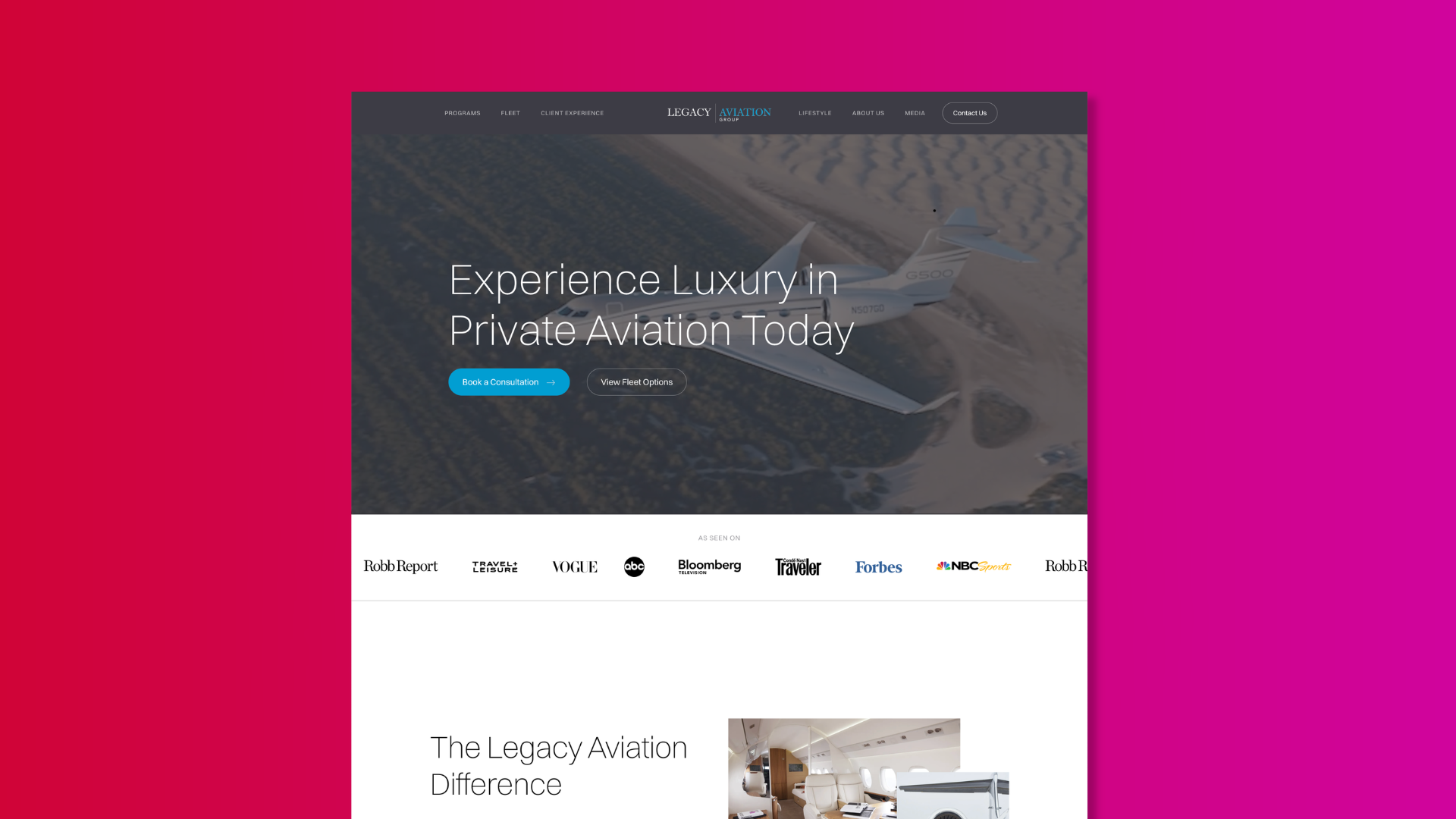 A complete design, development, and content overhaul transformed Legacy Aviation Group's digital presence into a high-end experience worthy of their elite private aviation brand.